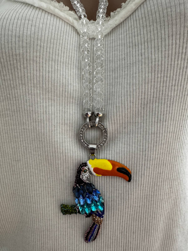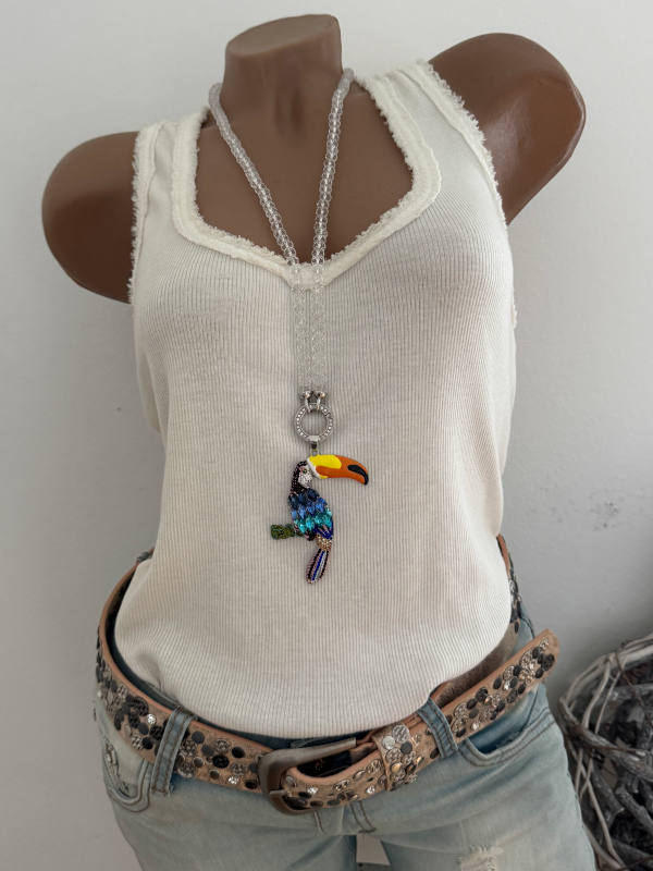 Unser Kommentar zu "VARIO Halskette lang transparente Kristallperlen Kette mit Strass Glitzer "BUNTER TUKAN" Anhänger Ne"