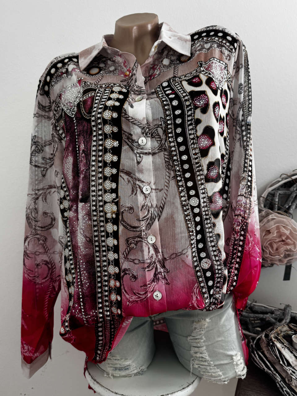 Unser Kommentar zu "MISSY Bluse M 38 Hemdbluse pink Nietenprint Leomuster Print Glitzer Neue Kollektion"
