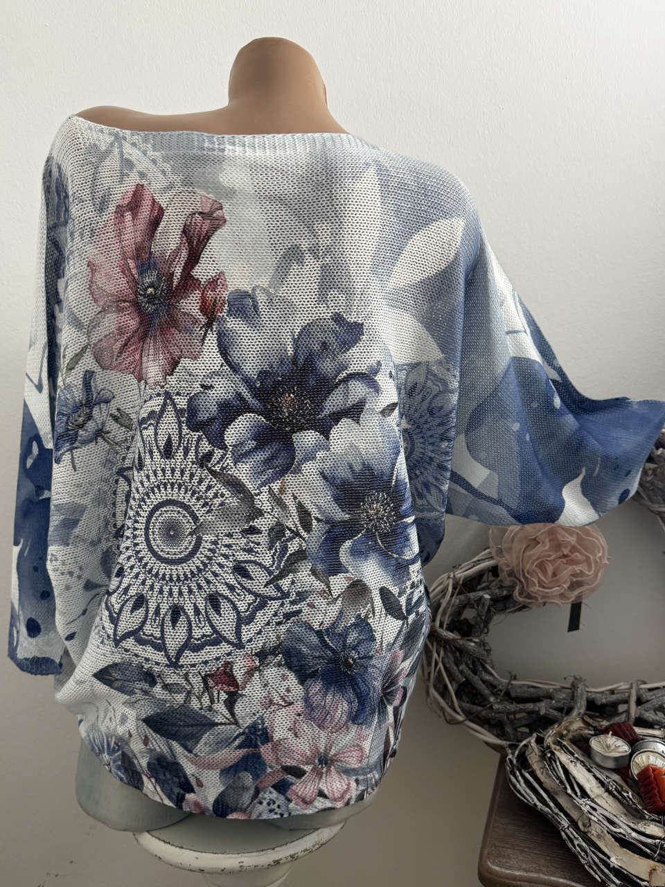 Tunika 36-42 Fledermausarm Feinstrick Floral Blumen blau rosa Tunika Pulli bunt NEU Made in Italy 1/