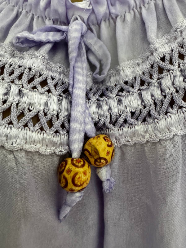 (je kleiner Deine Grösse desto lockerer sitzt die Tunika)Brustweite/Achselweite ungedehnt:60cmGesamtlänge:72cmauch Off-Shoulder tragbarBändchen mit Holzkugeln verziertFarbe:lilaLochmuster am Ausschnitt95% Viskose 5% ElasthanJeans etc.nur Deko