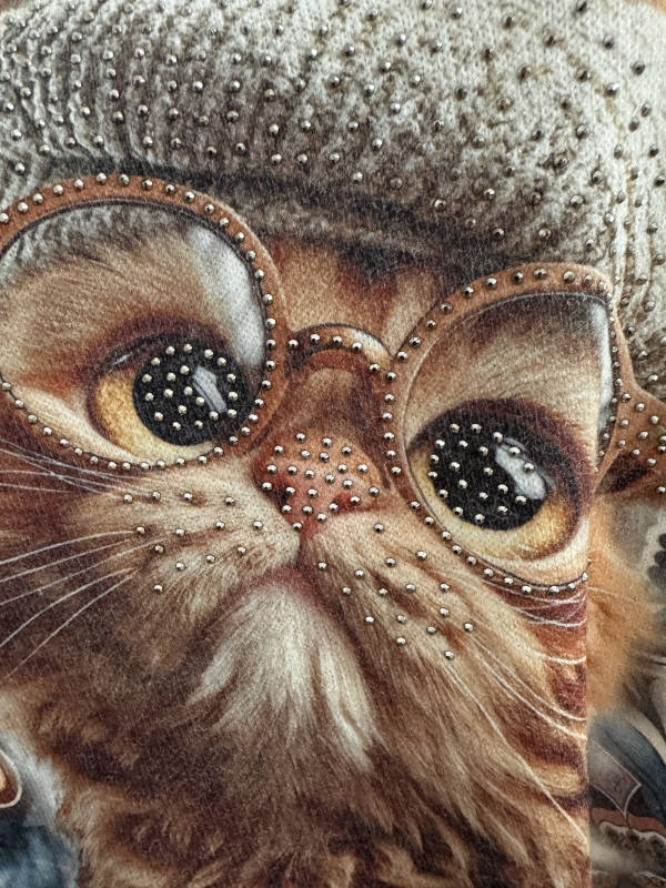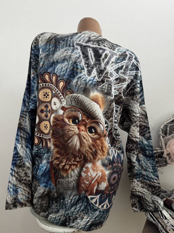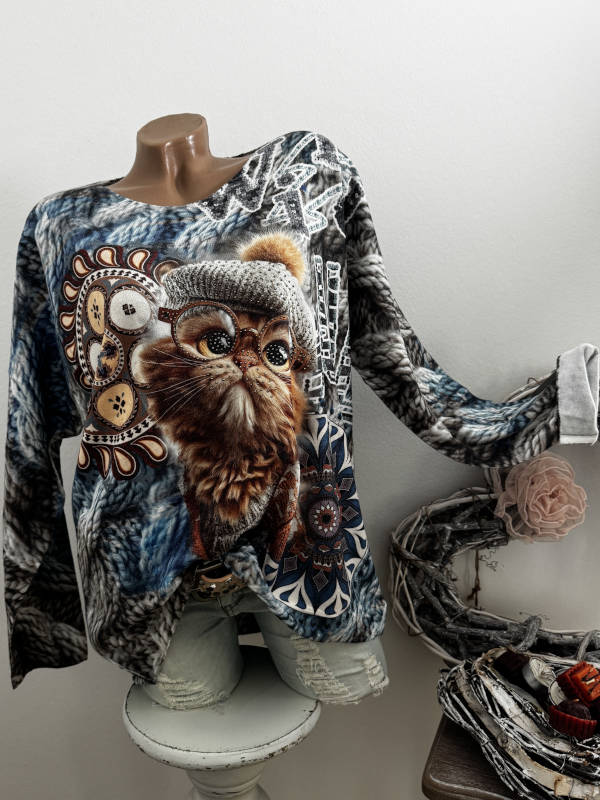 Unser Kommentar zu "Longsleeve Feinstrick Tunika Pulli bunt helle Katze mit Brille 40-44 Made in Italy"