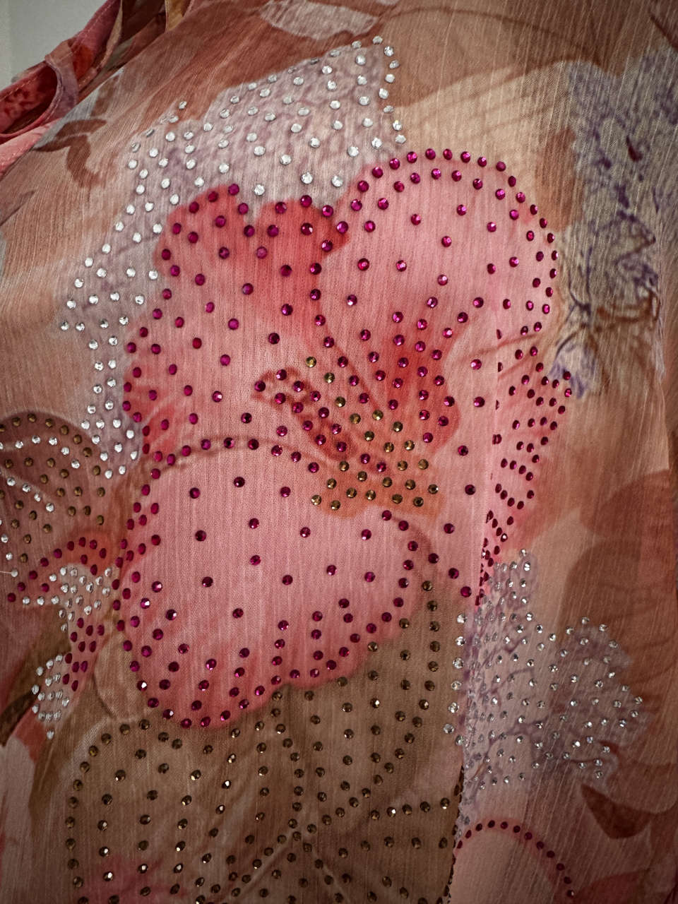 Bluse Missy L 40 Langarm Hemdbluse Tunika rosa floral Kolibri Bindebändchen Neu Glitzer Nieten