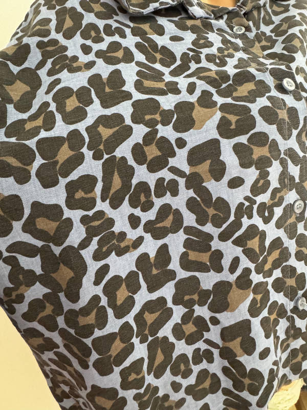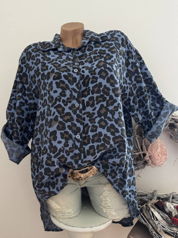 Neu mit Etikett aus Italien Long Tunika Hemdbluse Onesize = passt hier bei Grössen 38-44 (Je kleiner die eigene Größe um so lockerer sitzt die Bluse) Brustweite/Achselweite:65cm Gesamtlänge:vorne 68cm hinten 82cm 3/4 Turn up Ärmel Farbe:blau schwarz Leo 100% Viskose Jeans etc nur Deko