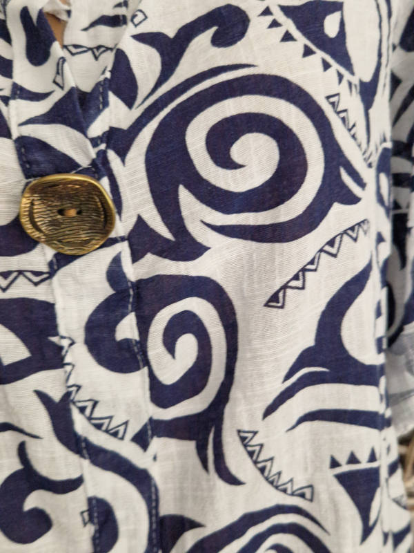 Unser Kommentar zu "Bluse Tunika Baumwolle grosser Knopf weiss/blau 40-44 1/2 Arm Made in Italy NEU"
