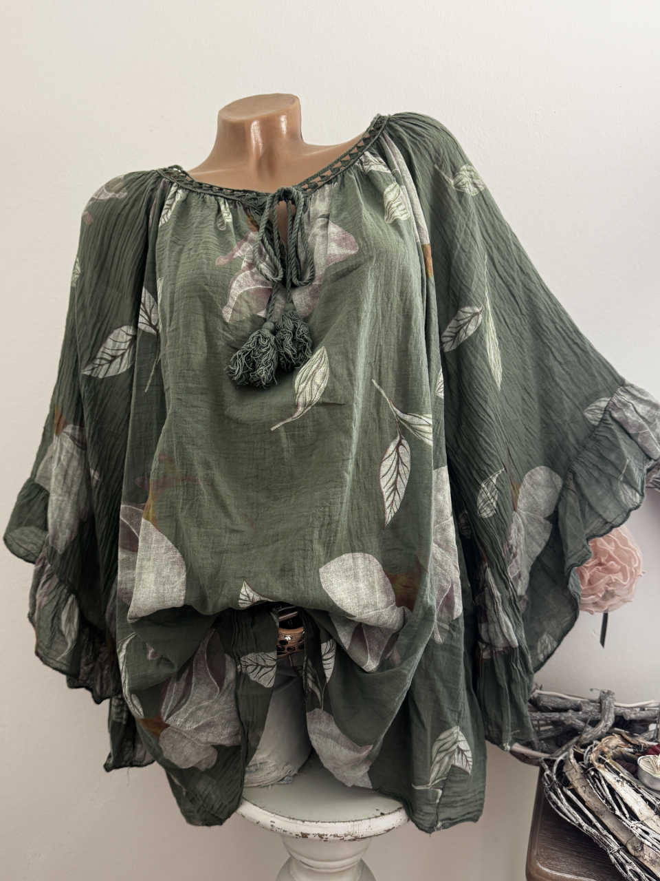 weite Ärmel oliv floral Tunika Bluse 38-48 Baumwolle Made in Italy