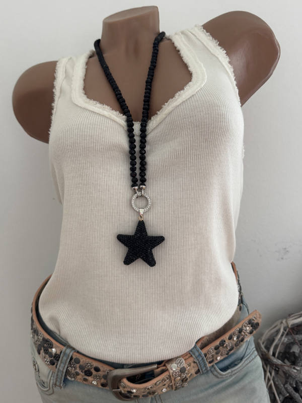 lange schwarze Kristallperlenkette mit abnehmbarem schwarzem 3D STERN Strass Anhänger