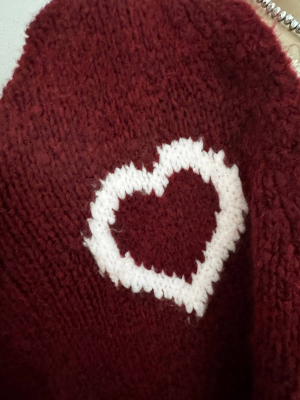 Unser Kommentar zu "Cardigan Strickjacke mit Mohair 38-44 Ärmel überschnitten bordeaux rosa Herzen Made in Italy"