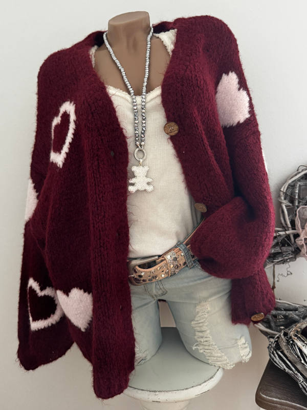 Cardigan Strickjacke mit Mohair 38-44 Ärmel überschnitten bordeaux rosa Herzen Made in Italy