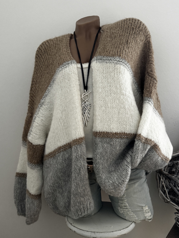 Unser Kommentar zu "Cardigan Strickjacke Oversized Made in Italy 40-44 Ärmel überschnitten beige grau weiss"