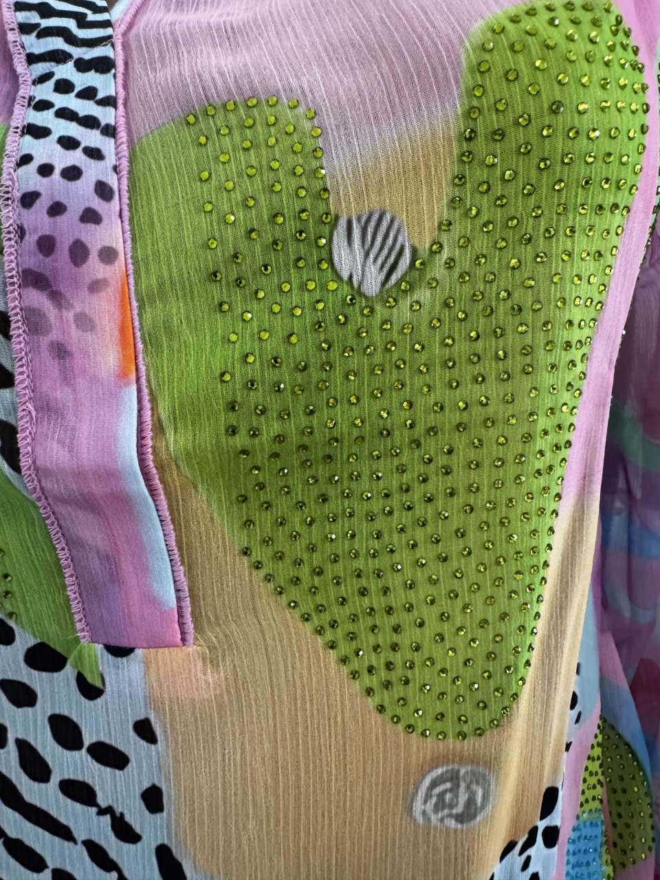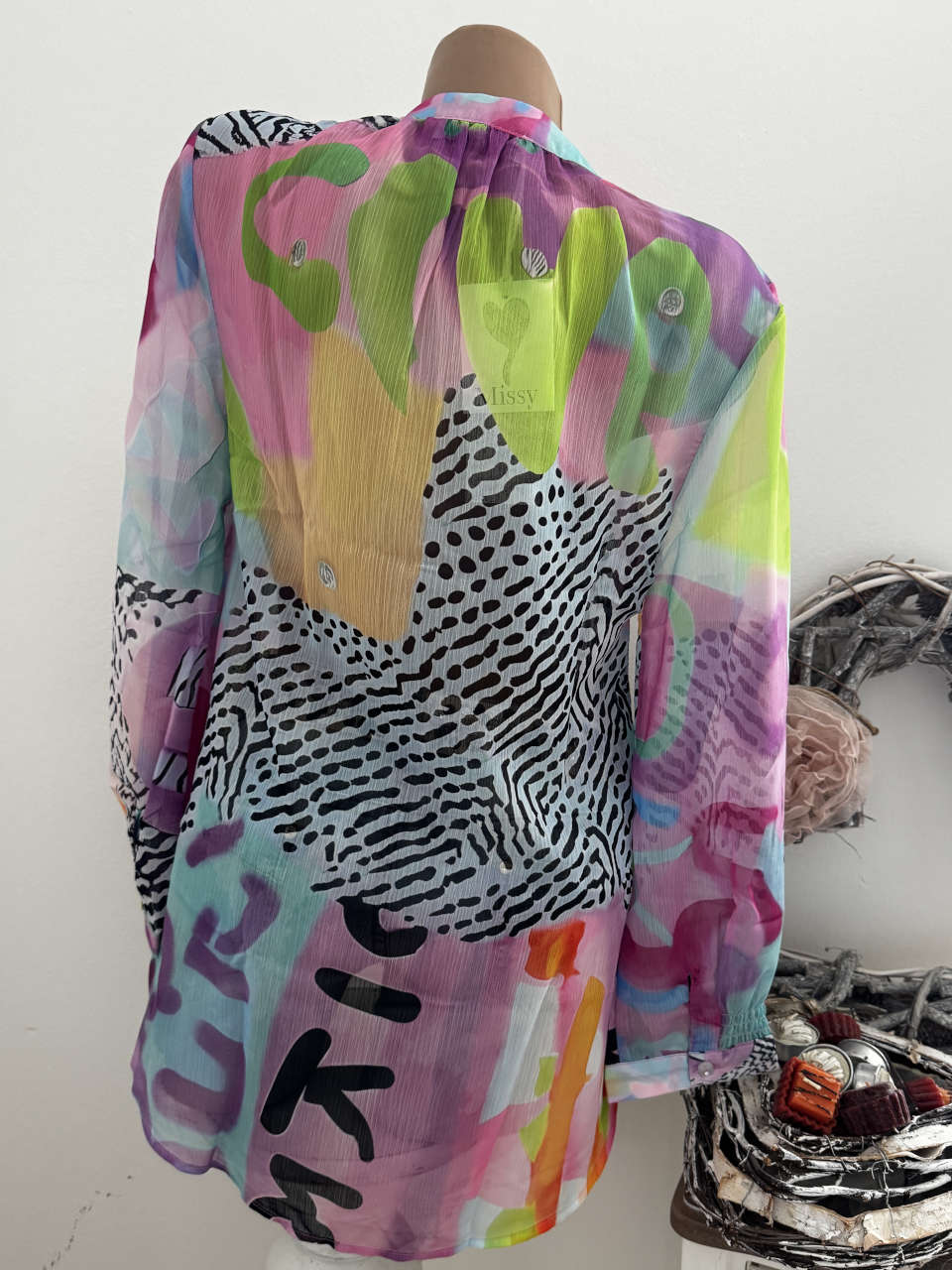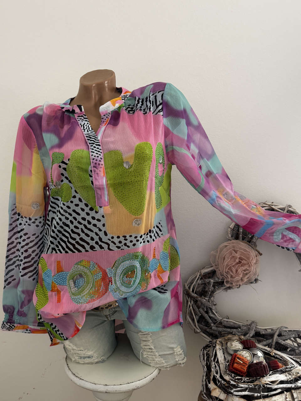 etc sind hier nur Deko Unser Kommentar zu "Missy Bluse V-Neck L 40 Tunika Buchstaben gemustert bunt Langarm Ärmel gesmokt Glitzersteinchen"