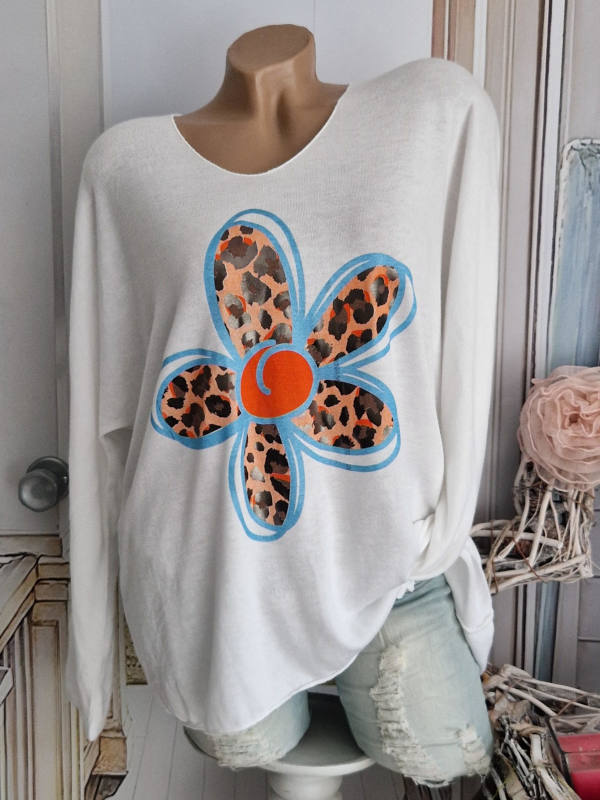 Neu mit Etikett aus Italien GANZ WEICH UND EHER LEICHT ALSO DÜNNER Tunika Longsleeve mit Print Onesize= passt hier bei Gr. 40-44 (je kleiner Deine Grösse ist desto lockerer fällt es aus) Brustweite/Achselweite Ärmel überschnitten:71cm Gesamtlänge: 61cm vorne bedruckt hinten weiss weiter oversized Schnitt Farbe:weiss mit Print 50% Viskose 50% Polyester