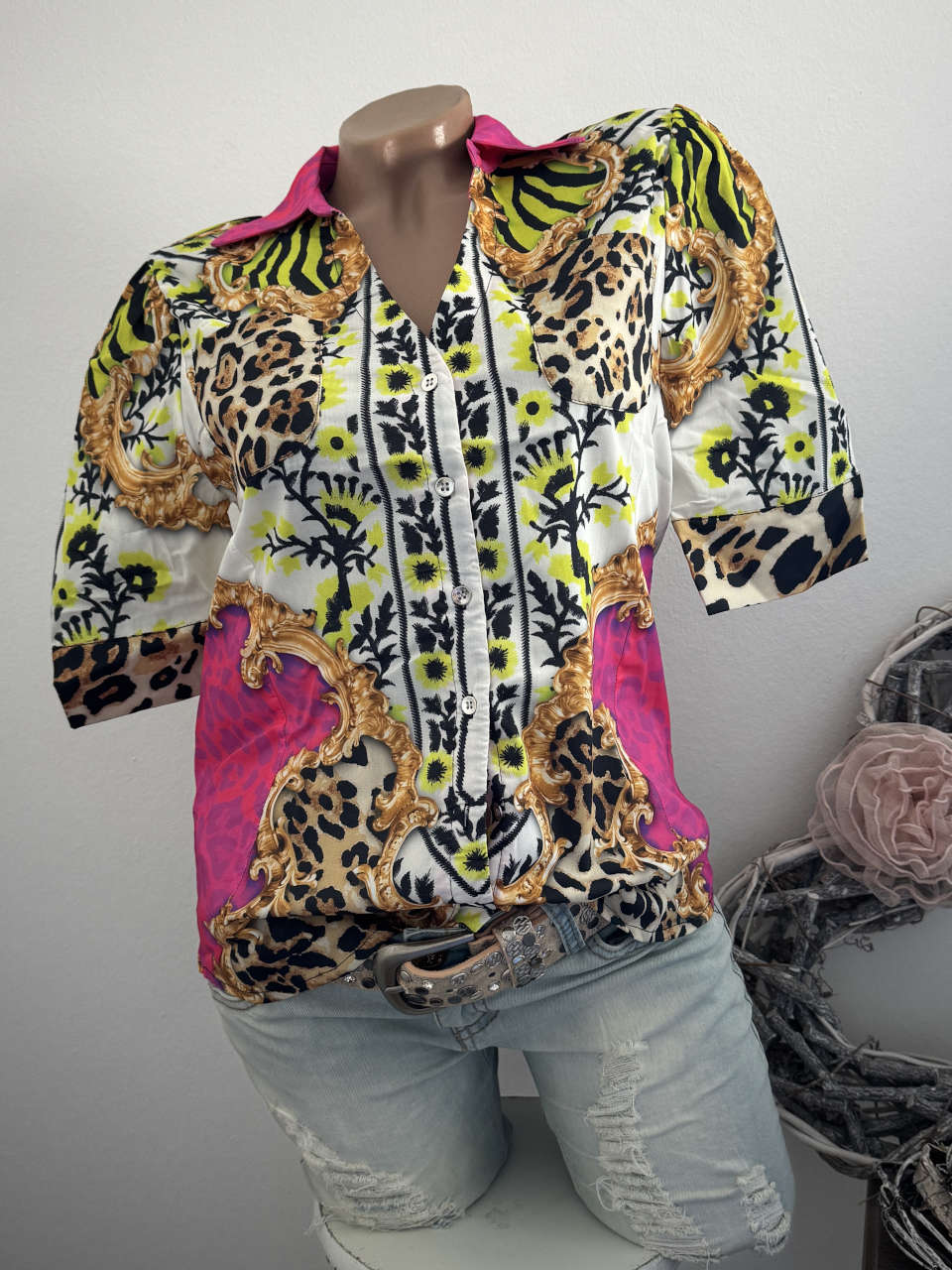 Neu mit Etikett von Missy pink bunte Kurzarm Hemdbluse mit durchgehender Knopfleiste S= entspricht hier Gr.36 Brustweite/Achselweite:46cm Gesamtlänge:61cm komplett vorne und hinten bedruckt vorne durchgehende Knopfleiste 98% Polyester 3% Elasthan