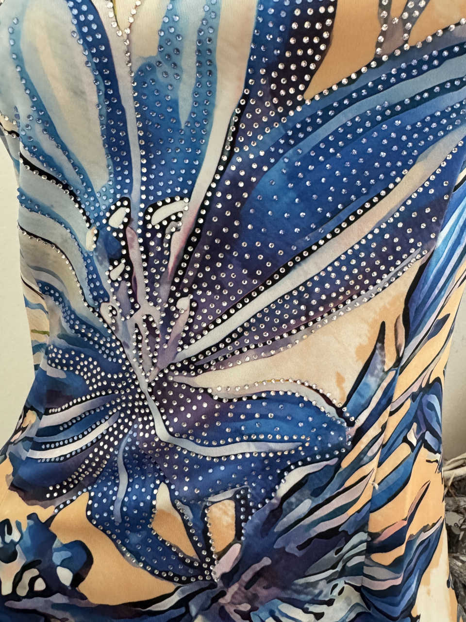 hinten mit Reissverschluss Farbe:beige weiss blau Blumen Vorderseite mit Glitzernieten 89% Polyester 11% Elasthan