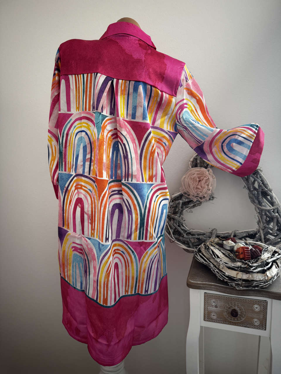 Neu mit Etikett von Missy Tunika Kleid mit Knopfleiste S= passt hier bei Grössen 36 Brustweite/Achselweite oversized:55cm Ärmellänge ab Schulter gemessen:46cm Gesamtrückenlänge:94cm Farbe:Multicolor bunt 100% Polyester