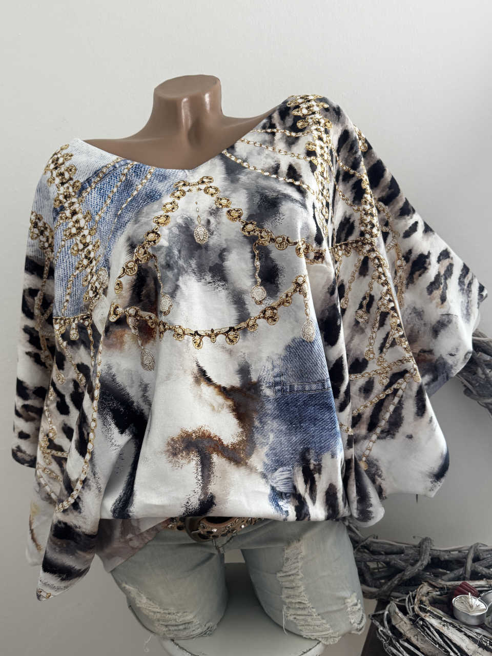 Unser Kommentar zu "MISSY Feinstrick Tunika Fledermausarm 38-44 jeans bunt gemustert Neu Glitzer Nieten"