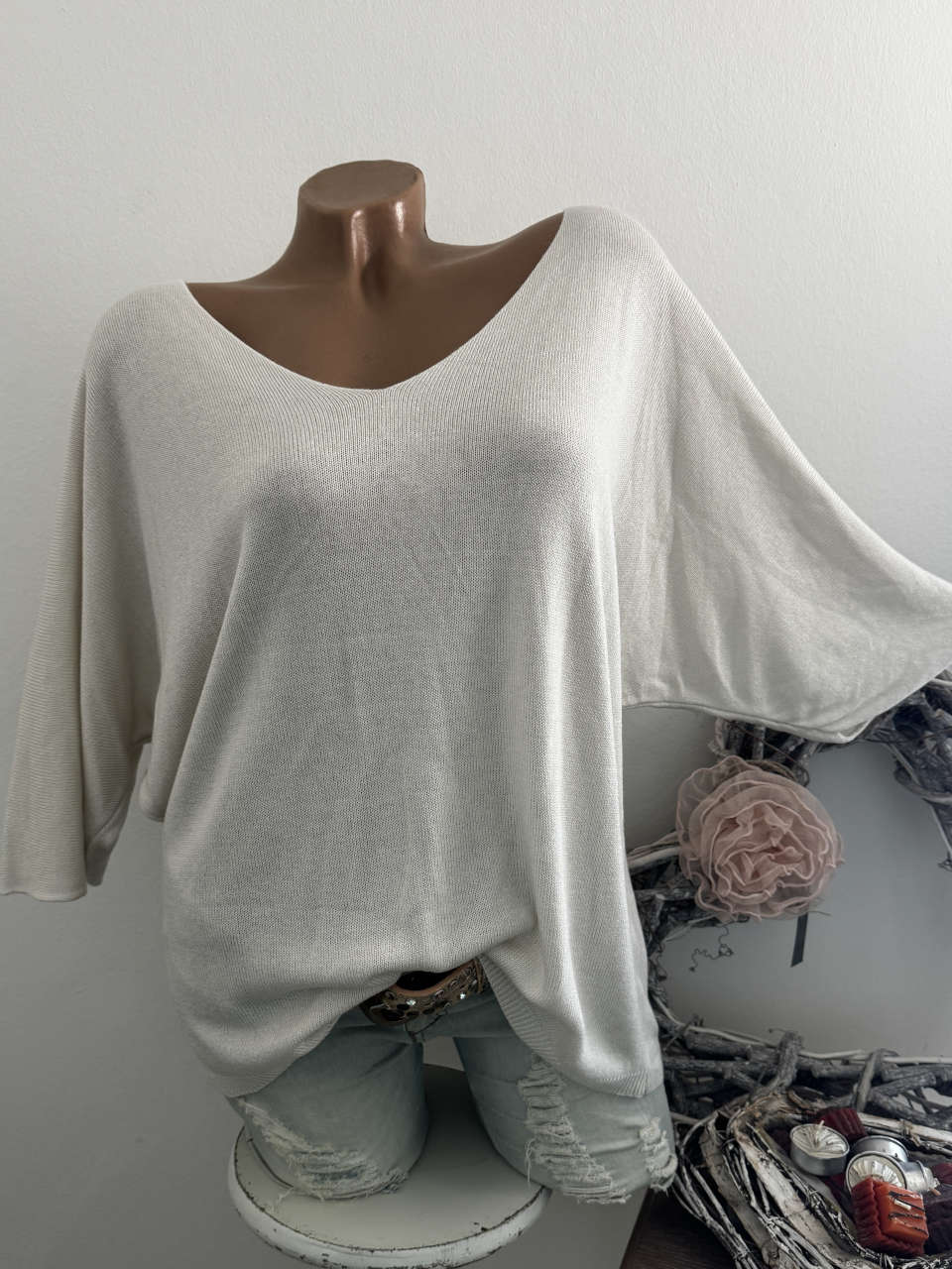 Unser Kommentar zu "Tunika Glattstrick wollweiss Pullover Oversized Italy 38-42 Fledermausarm 1/2 Arm"
