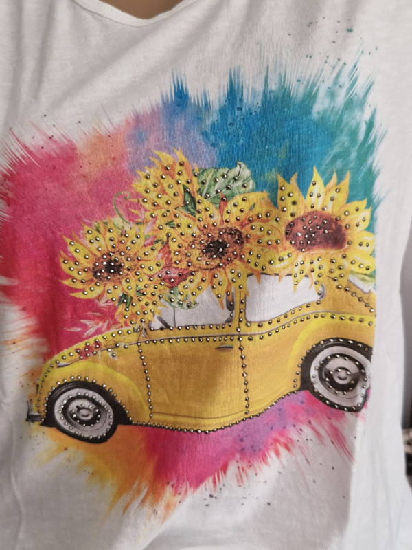 Unser Kommentar zu "T-Shirt Shirt 36-42 weiss Käferauto Sonnenblumen Italy Nieten NEU"